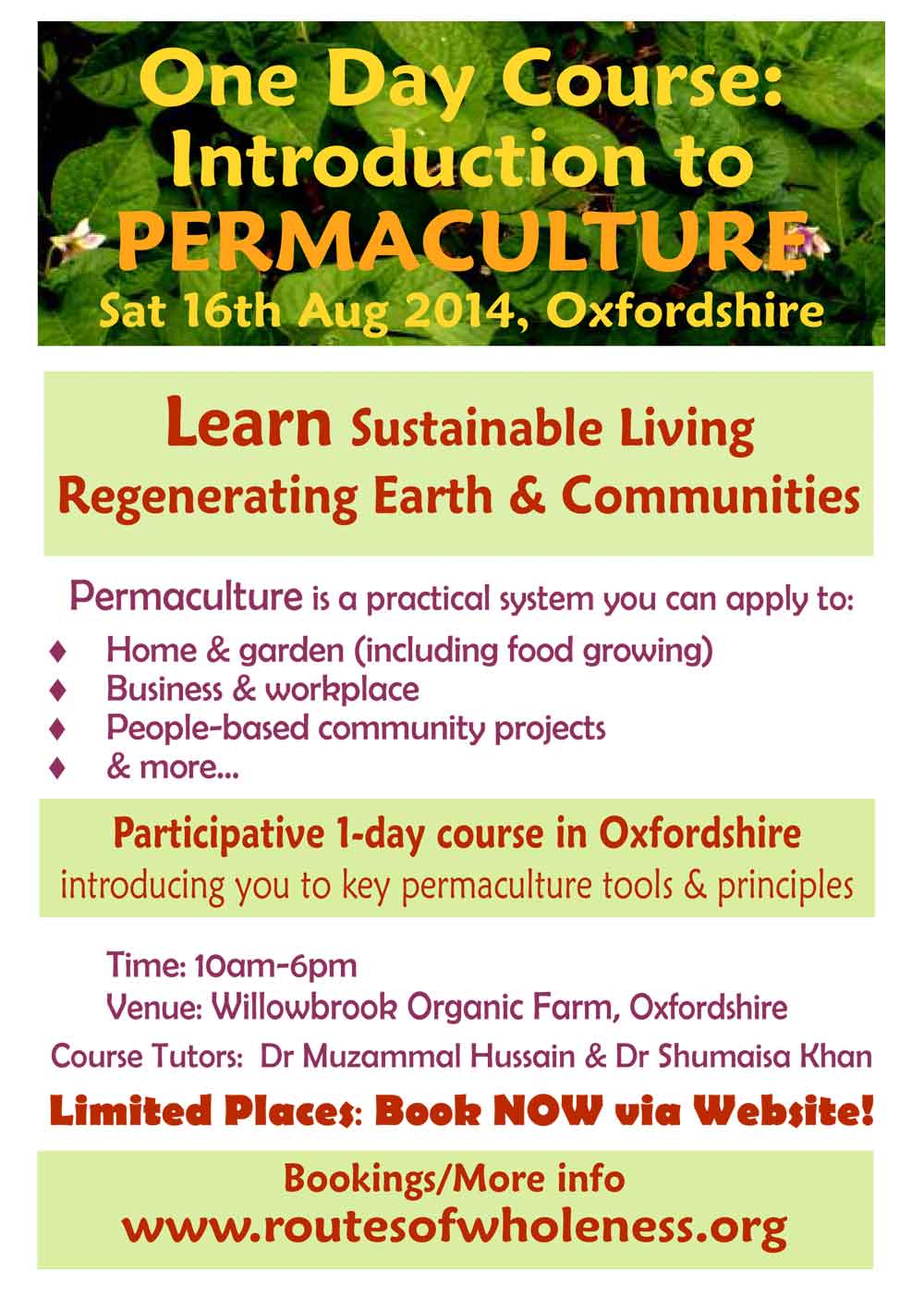 Tickets £6 waged / £4 unwaged. On the door only: for entrance to the Permaculture Festival: No additional cost for the Workshop!